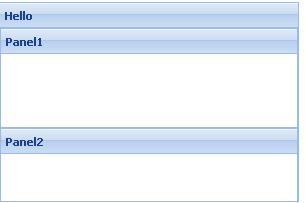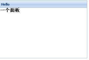 var panel=new Ext.Panel({renderTo:"panel",title:"Hello",width:300,height:200,html:"<h1>一个面板</h1>"});