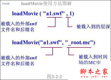 于是使用loadMovie就显得很重要了。现在就让我们从基础开头,然后去分析使用loadMovie所涉及到的具体问题吧。使用loadMovie有两种基本的方法:(一)将外部swf 文件载入到某一层上。(二)将外部 swf文件载入到时间轴的某个影片剪辑中。对这两种方法的使用,用图表示更加直观些。见图2-2-2