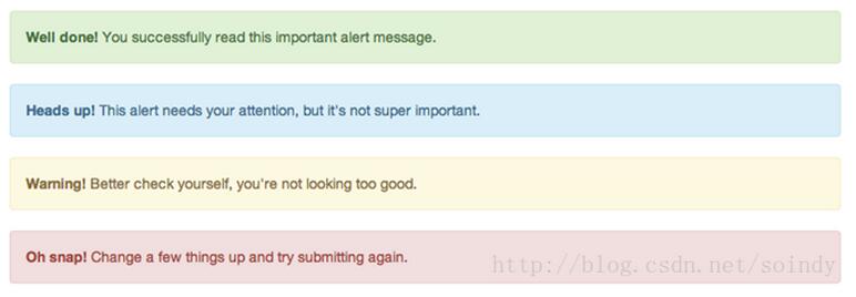 Bootstrap框架通过“alert“样式来实现警示框效果。在默认情况之下,提供了四种不同的警示框效果: