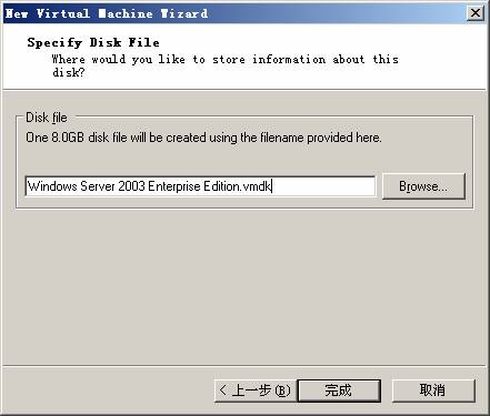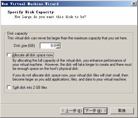 13. 设置虚拟机磁盘大小为8G 即可,其它两项可选可不选(在xp 系统中需要选择Split disk into 2GB files )