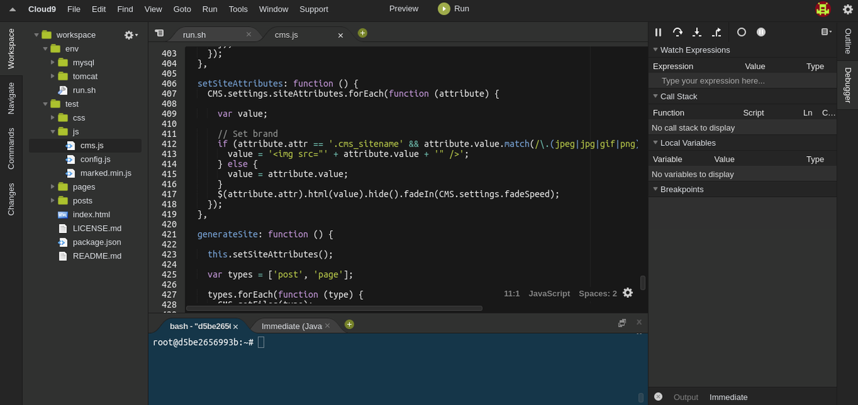 docker run -d -it --name=cloud9 -v $(pwd)/workspace:/workspace -p 8181:8181 zuolan/cloud9-ide --auth user:password