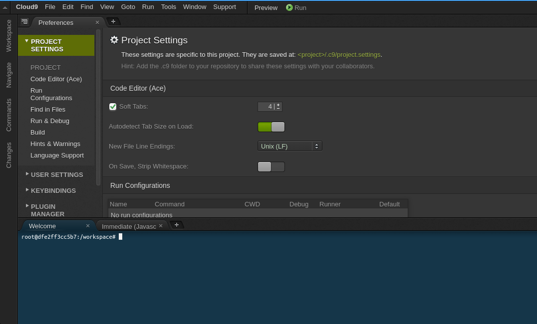 首先熟悉一下界面,你可以点击 右上角 的设置按钮配置IDE,Cloud9 IDE功能很强大,不逊色与Eclipse Che,而且Cloud9 IDE内存占用要小得多,因为Cloud9 IDE是基于Node.js的。