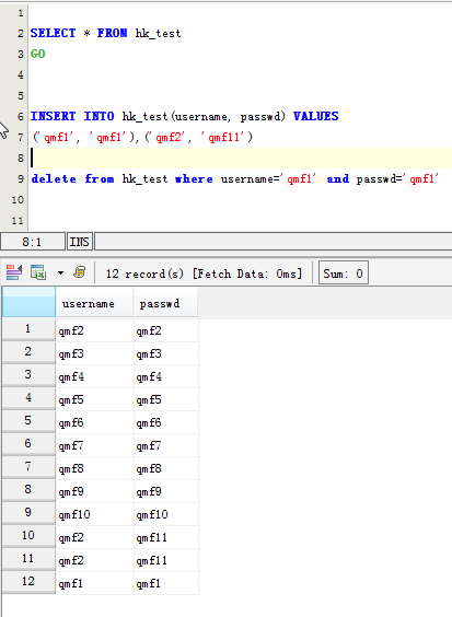delete from hk_test where username='qmf1' and passwd='qmf1'