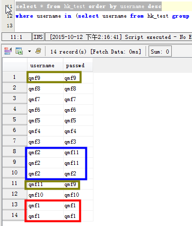 select * from hk_test where username in (select username from hk_test group by username having count(username) > 1) SELECT username,passwd FROM hk_test WHERE username in ( SELECT username FROM hk_test GROUP BY username HAVING count(username)>1) 但是这条语句在mysql中效率太差,感觉mysql并没有为子查询生成临时表。在数据量大的时候,耗时很长时间