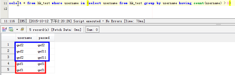 select username,passwd,count(*) from hk_test group by username,passwd having count(*) > 1