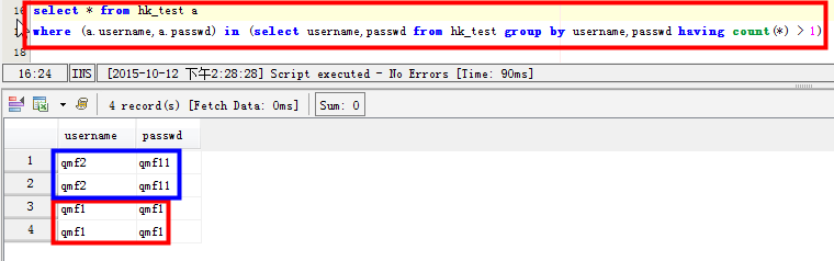 场景三:查看两个字段都重复的记录:比如username和passwd两个字段都有重复的记录: