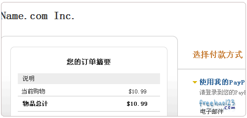 3、最后使用Paypal支付10.99美元就可以得到一年的.COM域名+一年的Whois保护服务了。