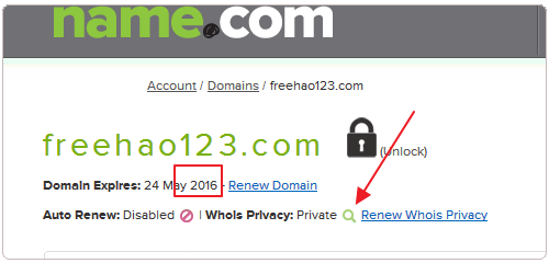 9、Name.com域名续费一年成功,含一年的Whois保护服务。