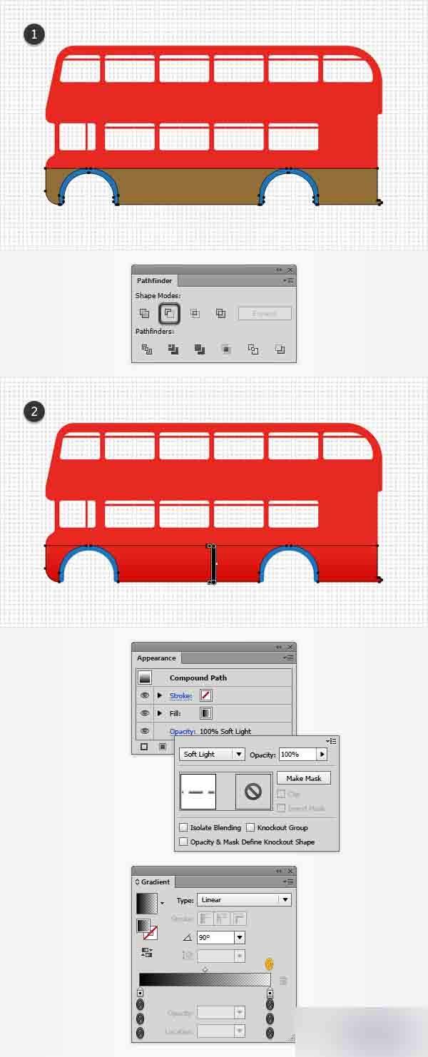 重新选择蓝色的复合路径并聚焦到外观面板上。 改变混合模式为柔光,然后用下图所示的线性渐变替换蓝色,记住在黄色的数字代表透明度的百分比。