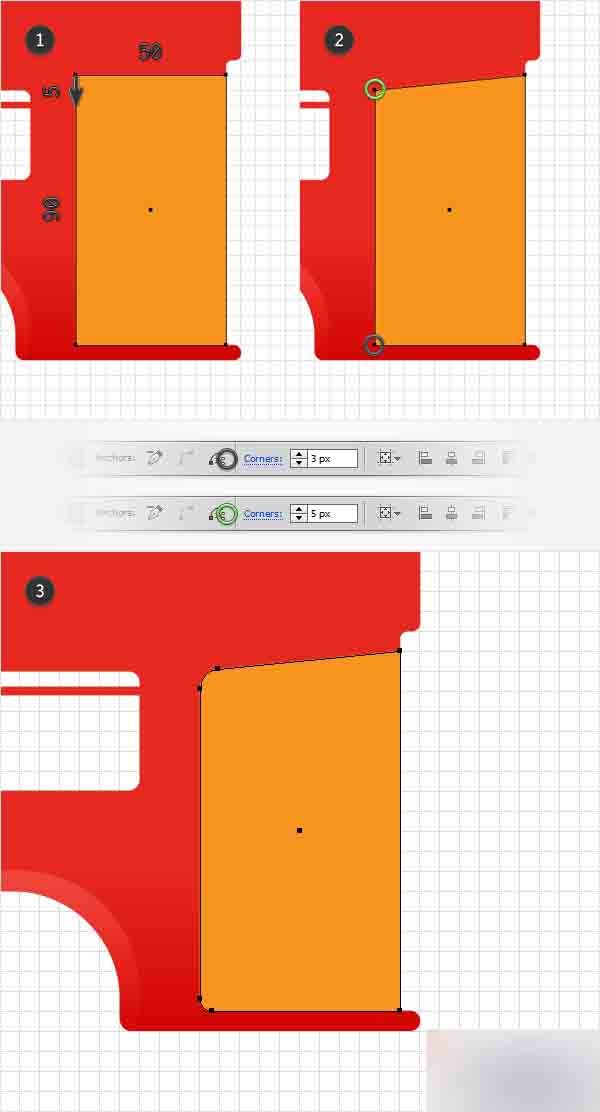 确保移动的锚点一直被选中,转到顶栏并在圆角框中输入5px。 接着到底部,左边的锚点,选中它,回到最上面一栏,这次在圆角框中输入3px。 最终橘色的形状应该看起来像第三张图的样子。