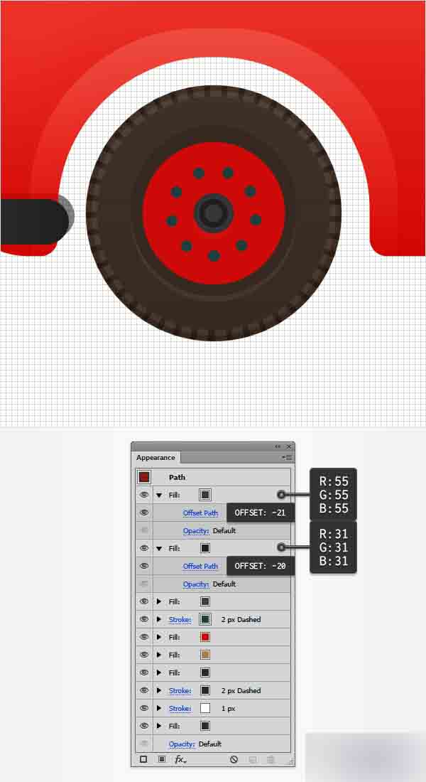添加一个新填色并将其拉动面板的顶部。 设置其颜色为 R=55 G=55 B=55然后转到效果>路径>偏移路径。输入-21px的偏移量并点击确定。