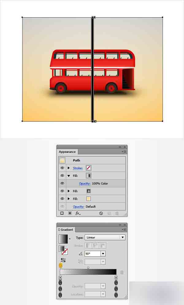 确保背景图形被选中,关注到外观面板并添加第三个填充。 选中它,改变混合模式为色彩并用下图所示的线性渐变替换现存的颜色。