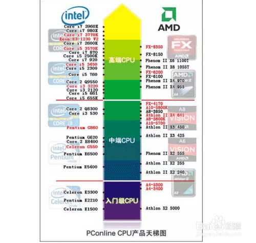 cpu:即处理器,就如同人的大脑。当下的处理器主要有Intel和AMD两家,比较知名的酷睿i3 i5 i7等,至于奔腾 赛扬什么的早已经被时代所淘汰,建议不考虑。i5是当前的主流配置,游戏党建议入手,i3要稍早一些,比i5的性能稍差,功耗也大一些,但也可以,i7是intel最新推出的一款处理器,性能卓越,但价格比较贵,预备充足的同学可以考虑,另外同样是i5,型号也不同,比如4200m 4200u 4200h 这个4代表i5的第四代 m代表标准电压 u代表低电压 h代表高电压,一般来说数字越大越好,电压高的要比低的性能更强。图中是处理器的天梯图