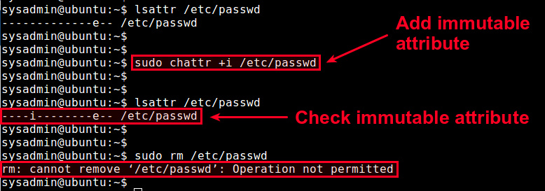 为了让一个文件不可变更,你需要按照如下方法为这个文件添加“不可变更”标志位。例如,对/etc/passwd文件做写保护: