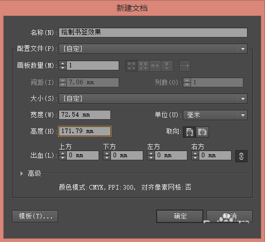 1、单击”文件-新建“,在弹出的”新建文档“对话框中,设置文件名为”绘制书签效果“,并设置其他相关参数。完成后单击”确定“按钮。