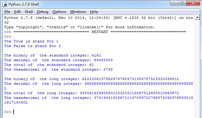 #coding=utf8 def integerType(): ''''' 布尔型: 该值的取值范围只有两个值:True(1)、False(0) ''' Tbool=True Fbool=False print "The True is stand for %d" %(Tbool) print "The False is stand for %d" %(Fbool) print ''''' python标准整数类型: Python标准整数类型是最通用的数字类型。 在大多数32位机器上,标准整数类型的取值范围:-2147483648 到 2147483647 Python标准整数类型等价于C的有符号长整型。 八进制整数以数字“0”开始。 十六进制整数以“0x”或“0X”开始 ''' bInt=010101 dInt=84455555 oInt=075 hInt=0xabc print "The binary of the standard integer:",bInt print "The decimal of the standard integer:",dInt print "The octal of the standard integer:",oInt print "The hexadecimal of the standard integer:",hInt print ''''' python长整型: Python长整型能表达的数值仅仅与机器值的(虚拟)内存大小有关。 长整数类型是标准整数类型的超集。 在一个整数值后面加上个L(大写或小写都可以,推荐使用大写,避免和数字1混淆),表示这个整数时长整数。 这个整数可以是十进制、八进制、十六进制。 只有对长整数调用repr()才有机会看到L,对长整数调用str()看不到L。 整型和长整型正在统一为一种。 ''' bLong=0111111111111111111111111111111111111111111111L dLong=8888888888888888888888888888888888888888888888L oLong=0777777777777777777777777777777777777777777777L hLong=0XFFFFFFFFFFFFFFFFFAAAAAAAAAAAAABBBBBBBBBB78L print "The binary of the long integer:",repr(bLong) print "The decimal of the long integer:",repr(dLong) print "The octal of the long integer:",repr(oLong) print "The hexadecimal of the long integer:",repr(hLong) print '''''call the function : integerType()''' integerType()