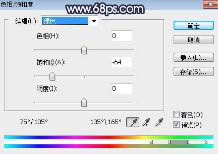 2、创建色相/饱和度调整图层,对黄色,绿色进行调整,参数设置如图2,3,效果如图4。这一步把背景主色转为中性色。
