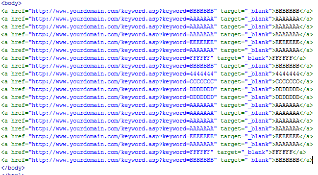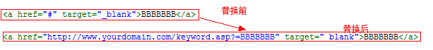 想法:想把<a href="#" target="_blank">BBBBBBB</a> 替换成 <a href="http://www.yourdomain.com/keyword.asp?=BBBBBBB" target="_blank">BBBBBBB</a>
