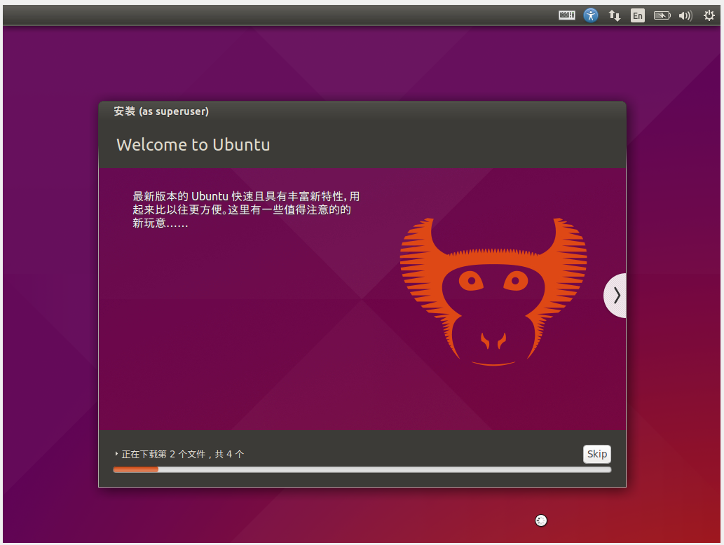 配置选择已完成,接下来请耐心等待安装过程,如图,请不要点击 SKIP