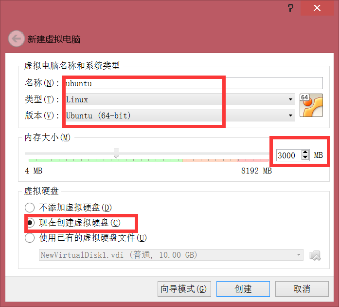 点击新建后会出来如下图所示的界面,一般如图填写即可,内存可酌情填写。