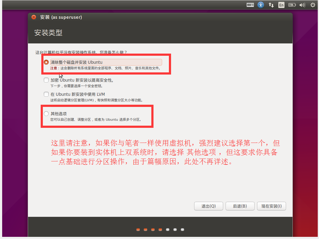 这里请注意,如果你与笔者一样使用虚拟机,强烈建议选择 清除整个磁盘并安装 Ubuntu ,但如果你要装到实体机与 Windows 形成双系统时,请选择 其他选项 ,但这要求你对 Linxu 有一定的了解且具备一定的基础进行分区操作,注意不要覆盖 Windows 的 C 盘,此处由于篇幅原因,不再详述。