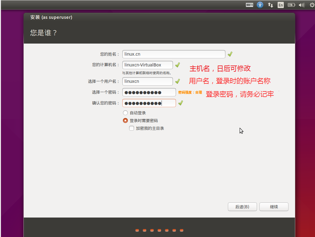 如图,进行用户设定,计算机名 是主机名,用户名 是登录时用的账户名称,密码 则是你所设 用户名 的登录密码,请务必记牢。