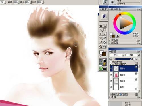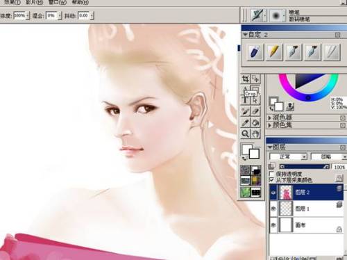 开始刻画人物的面部。选择喷枪工具里的数码喷枪(图4)。根据人物的面部结构减轻笔压,进一步的刻画。这时候给脸部加上了些红晕,显得自然些。