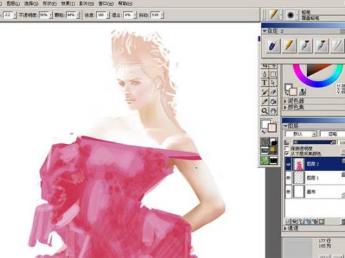 现在在人物图层用油性蜡笔工具里的矮胖油性蜡笔(图2),大致的绘制出明暗关系。