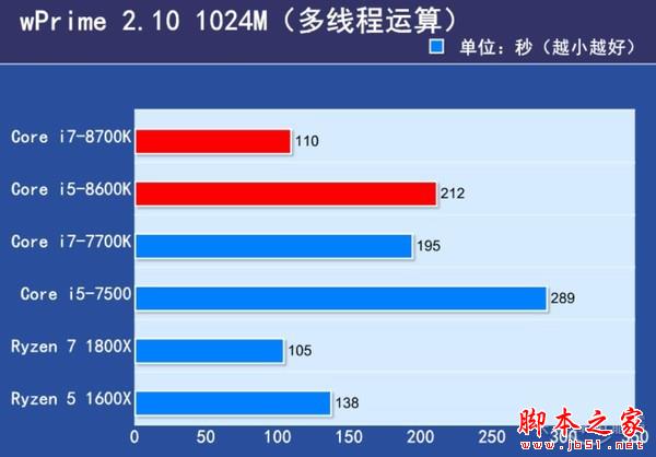 wPrime对多线程支持很好,Core i7-8700K计算1024M位圆周率用时110秒,性能比Core i7-7700K领先85秒,非常接近8核的Ryzen 7 1800X处理器,而Core i5-8600K用时212秒,用时比4核的Core i5-7500减少了1/3左右。