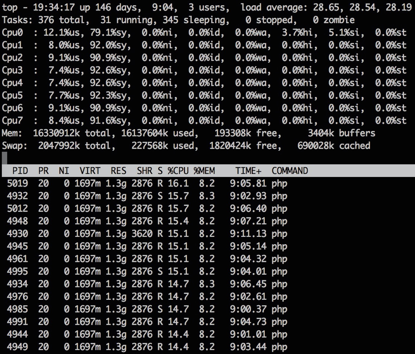 在本例中大家很容易发现 CPU 主要是被若干个 PHP 进程占用了,同时 PHP 进程占用的比较多的内存,不过系统内存尚有结余,SWAP 也不严重,这并不是问题主因。