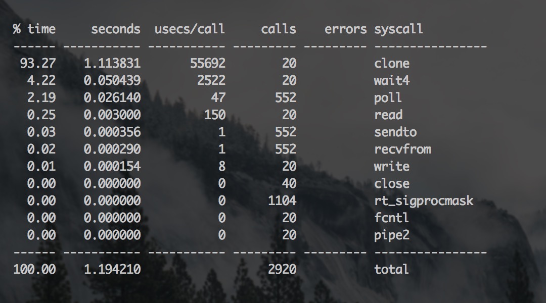 闲言碎语不要讲,轮到Strace出场了,统计一下各个系统调用的耗时情况: