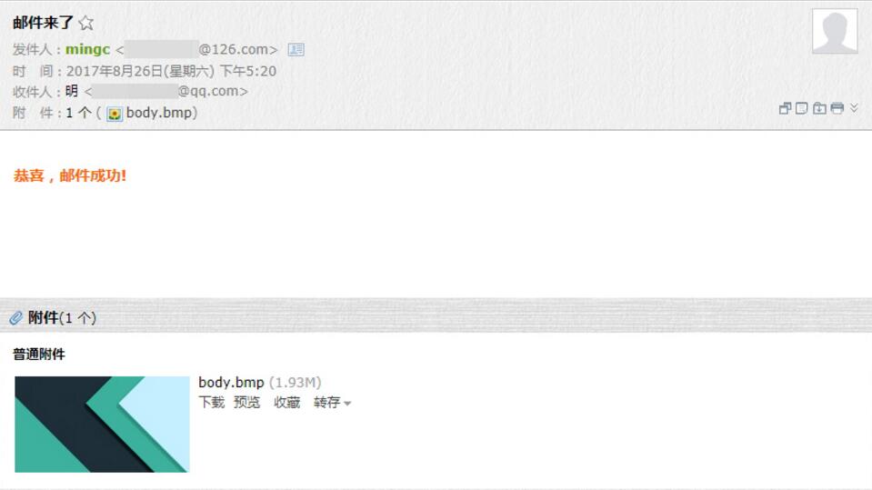 $ok = $mail->sendMail('xxxxxxxxx@qq.com', 'mingc', '邮件来了', '<p style="color: #f60; font-weight: 700;">恭喜,邮件成功!</p>', 'C:/Users/Administrator/Desktop/body.bmp');