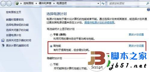 图9 选择“高性能”电源计划 2、单击“更改计划设置”后,将“用电池”下的所有选项设为“从不”,并将“调整亮度计划”设为最大值(如图10)。