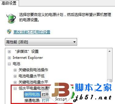 图11 把无线适配器设置为最高性能 4、展开“电池→低水平电池电量通知”,将“使用电池”设为“关闭”(如图12)。保存设置后,关闭所有应用程序,当电池电量充满后,拔掉AC适配器,用电池供电直至尽后自动关机,最后在关机状态下将电池充满即可。