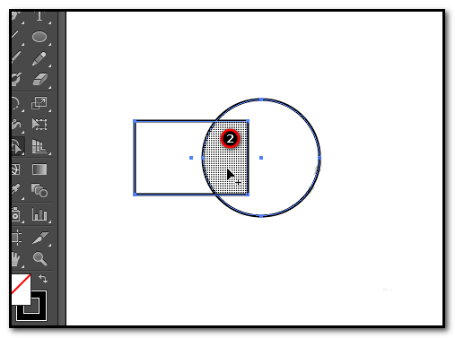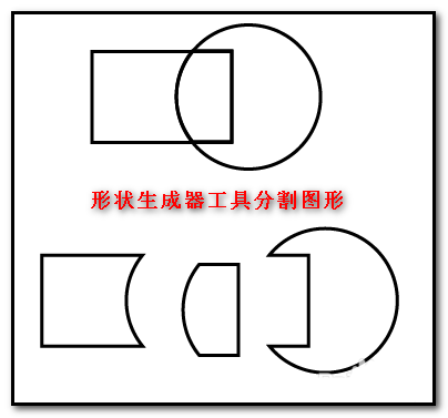 4、这时,鼠标就变成一个黑三角带着一个+字的图标。鼠标放拖过矩形和圆形上,这时,我们可以看到,矩形和圆形相交,形成了三个形状。形状生成器工具鼠标放在其中一个形状上,形状呈灰色网状。