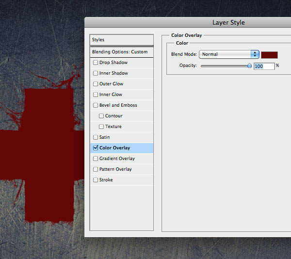 在合并图层上单击右键,选择混合选项。首先添加一个红色(#630707)的颜色叠加。