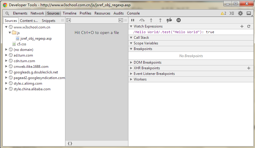 光是看代码,怎么也掌握不了正则表达式的,下面我们来实践一下:打开chrome(如果你还没安装chrome,那你不能算是本文的目标读者),当然安装了firebug的firefox或者高版本的IE也OK,,按F12,调出开发人员工具。切换到如下的选项卡,输入代码