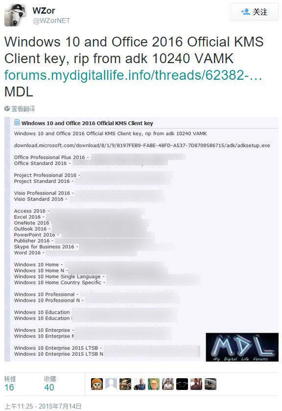 俄罗斯著名爆料人WZor在他的Twitter上公布了所谓的“Win10和Office 2016官方KMS激活密钥”,其中Windows10的密钥来自于Build 10240版本。