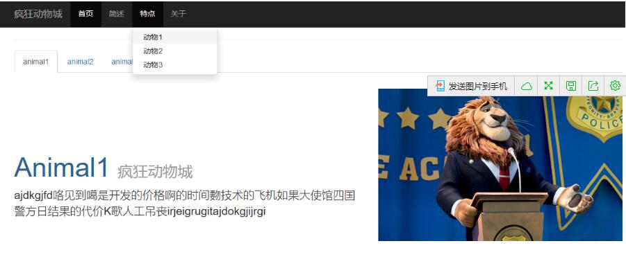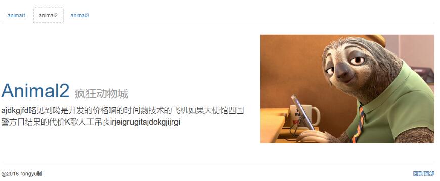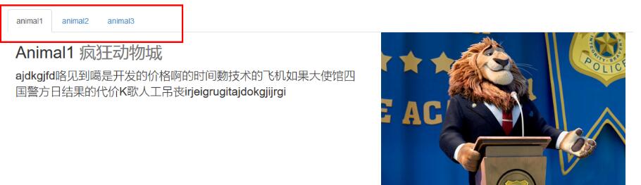 <ul class="nav nav-tabs" role="tablist"> <li class="active"><a href="#an1" role="tab" data-toggle="tab">animal1</a></li> <li><a href="#an2" role="tab" data-toggle="tab">animal2</a></li> <li><a href="#an3" role="tab" data-toggle="tab">animal3</a></li> </ul> <div class="tab-content"> <div class="tab-pane active" id="an1"> <div class="row feature"> <div class="col-md-7"> <h2 class="feature-heading">Animal1 <span class="text-muted">疯狂动物城</span></h2> <p class="lead">ajdkgjfd咯见到噶是开发的价格啊的时间覅技术的飞机如果大使馆四国警方日结果的代价K歌人工吊丧irjeigrugitajdokgjijrgi</p> </div> <div class="col-md-5"> <img class="feature-image img-responsive" src="image/1.jpg"> </div> </div> </div> <div class="tab-pane" id="an2"> <div class="row feature"> <div class="col-md-7"> <h2 class="feature-heading">Animal2 <span class="text-muted">疯狂动物城</span></h2> <p class="lead">ajdkgjfd咯见到噶是开发的价格啊的时间覅技术的飞机如果大使馆四国警方日结果的代价K歌人工吊丧irjeigrugitajdokgjijrgi</p> </div> <div class="col-md-5"> <img class="feature-image img-responsive" src="image/2.jpg"> </div> </div> </div> <div class="tab-pane" id="an3"> <div class="row feature"> <div class="col-md-7"> <h2 class="feature-heading">Animal3 <span class="text-muted">疯狂动物城</span></h2> <p class="lead">ajdkgjfd咯见到噶是开发的价格啊的时间覅技术的飞机如果大使馆四国警方日结果的代价K歌人工吊丧irjeigrugitajdokgjijrgi</p> </div> <div class="col-md-5"> <img class="feature-image img-responsive" src="image/3.jpg"> </div> </div> </div>