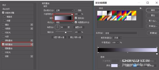 5、在图层样式对话框中选中左侧的“渐变叠加”样式,进行渐变颜色设置,单击渐变色块弹出“渐变编辑器”窗口,拖动滑块调整渐变颜色为灰色到黑色渐变,设置样式为“线性”,角度为90度,缩放为100%