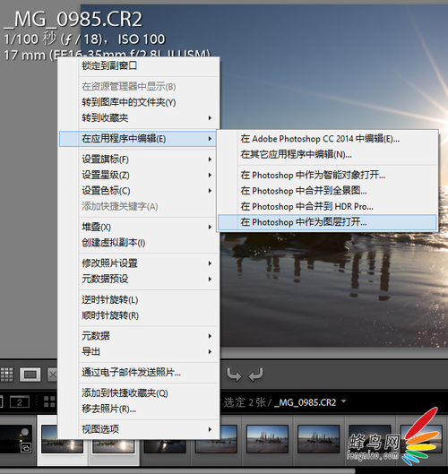 在Lightroom里面选中2张照片,点击右键 选择在应用程序中编辑,然后选择在Photoshop中作为层打开。