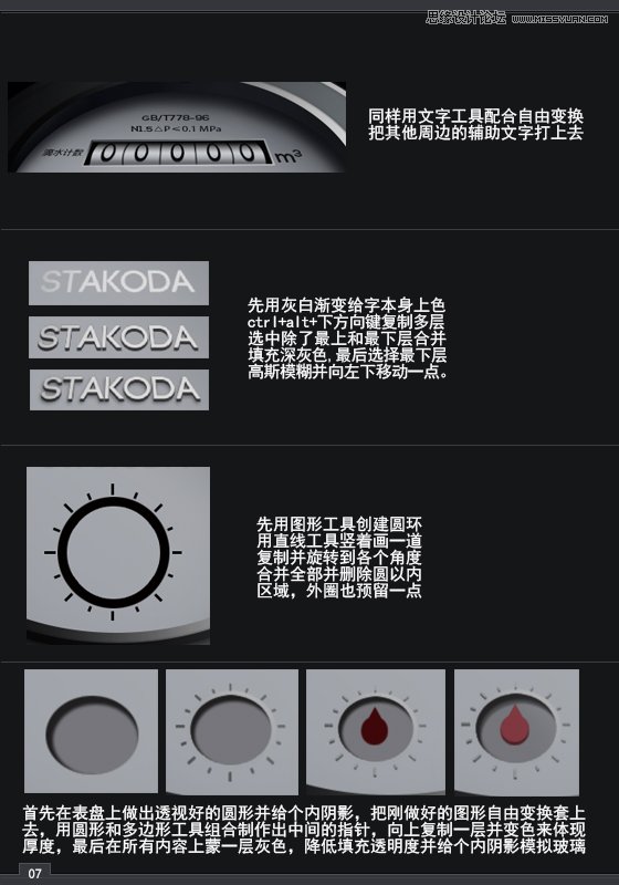 本教程是向大家介绍Photoshop绘制超真实的立体户外水表,绘制出来的水表超级逼真,教程有点难度,作者并没有对绘制过程做详细的解说,具体怎么操作,工具在哪里,该设多少参数统统略过没说,所以需要学习者有一定的PS基础。不过教程很实用,喜欢的朋友让我们一起来学习吧。