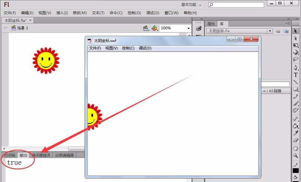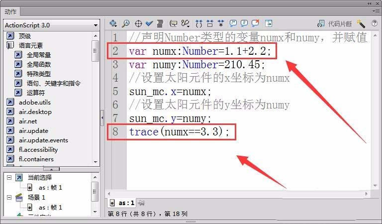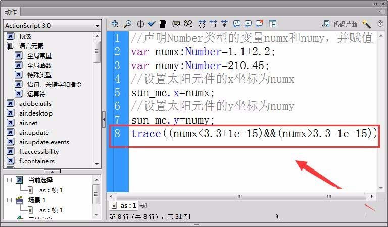 9、测试程序,从测试的结果可以看出,相加后的数值与两数相加的和“3.3”不同。在Flash中,整数计算没有误差,但浮点数计算总会出现误差,所以在使用“==”判断时值为“false”。