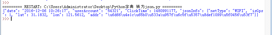 ========= RESTART: C:\Users\Administrator\Desktop\Python json转为字典.py ========= userAccount:54321 date:2016-12-06 10:26:17 jsonInfo: netType:WIFI addr:浦东新区长江南路1099弄56号 lon:121.5612 lat:31.1832 isGps:1 ClickTime:1480991177