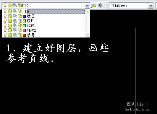 二、建立好图层,这个在前面没多说,图层是相当重要的,在二维如此,在三维中更是这样。甚至可以认为三维对图层的要求比二维更重要,这点大家慢慢就可能体得到。结合到这例,可以建立"镜框""镜片""手柄""临时1""临时2"几层,这个设多层全由自己习惯而定。