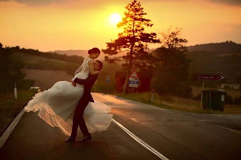 傍晚七点,意大利皮恩扎小镇的郊外,夕阳染红了整个天际,柔和而温暖,浪漫至极。新郎抱起新娘旋转,此时无需过多考虑表情,只要享受其中,动作幅度大些,尽可能让婚纱裙摆飘起来就可以了。最终呈现出的笑容很动人,一种幅写满幸福感的画面油然而生。逆光下的自动对焦不太准确,建议手动对焦。为了保留当时的整体氛围,并未给人物进行补光。