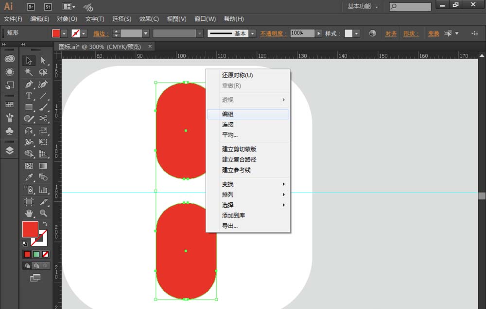 2、选择【矩形工具】,绘制一个矩形,将该矩形的四个角拉成圆角形;按【o】键,然后再按住【alt】+点击【白色背景图形的中心点】,出现如图界面,轴为水平,点击复制,就复制出了一个以白色背景图形的中心点为中心点且该矩形垂直方向上的矩形。选择这两个矩形,点击鼠标右键,点击【编组】,将它们编为一个组。