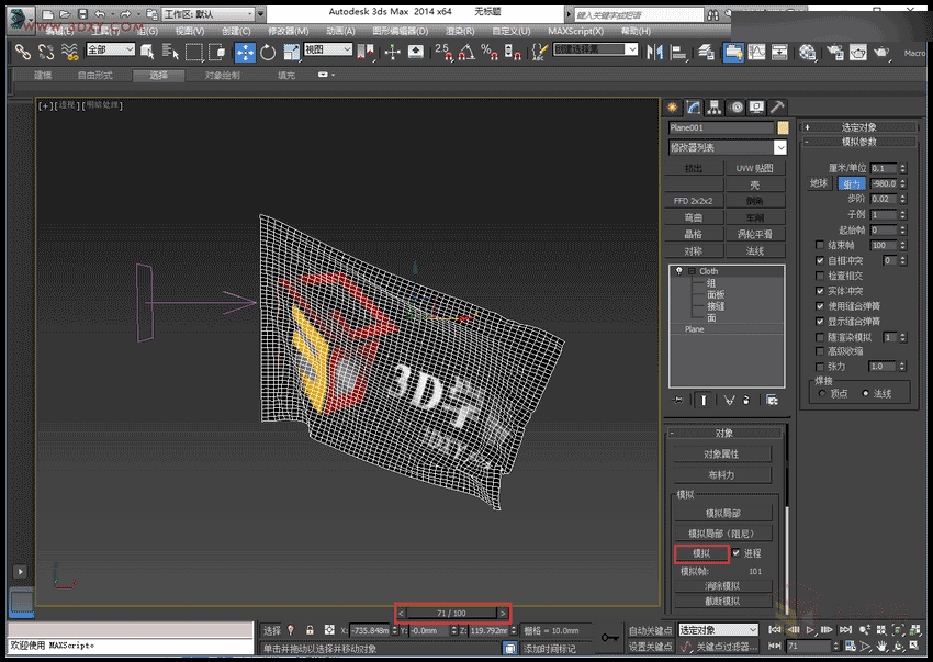 9,设置好之后点击模拟,完成后拖动时间条可以观察整个过程的动态,选择最适合的角度,渲染当前帧。
