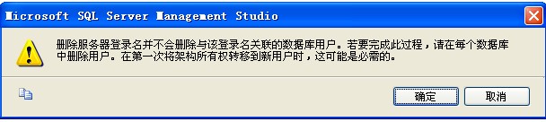 3. 其实在数据库级别的【安全性】创建的用户是属于全局的,当设置了某个数据库,比如TestLog之后,这个用户就会出现在这个数据库的【安全性】列表中。如果删除TestLog这个用户,会出现下面的提示。删除了后,这个用户就无法登陆了。需要去对应的数据库中删除用户,如果没有删除又创建,是会报错的。