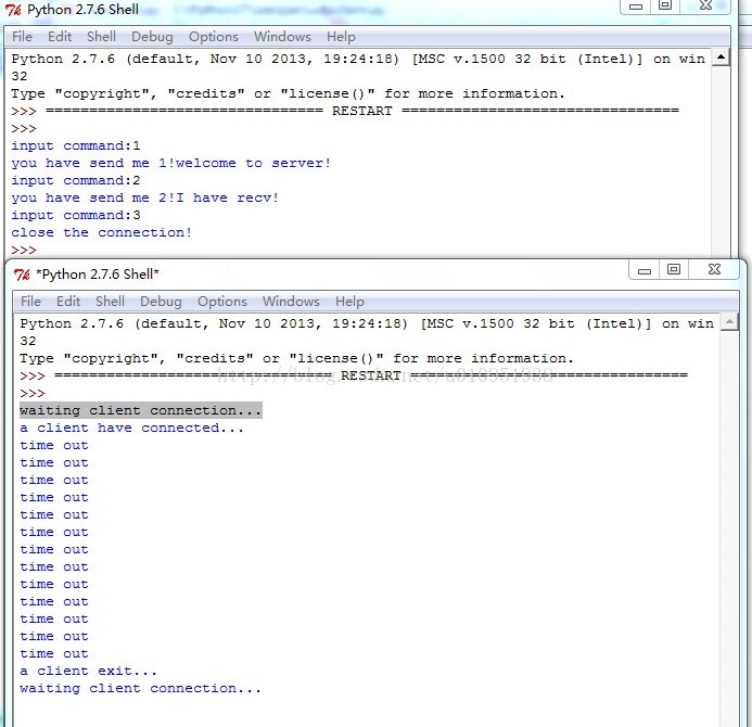 1.首先开两个IDLE,分别打开服务器端和客户器端代码。